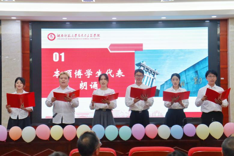 易珊作暖场讲话后,本硕博学生代表共同登台,深情朗诵《致吾师——马院学子的告白》,以此表达对学院全体教师的崇高敬意与真挚谢意。教师代表、2025年“湖南省最美教师”邓验教授结合自身七年的从教经历分享了感悟。她表示,自己的每一点成长都离不开学院、同事和学生们的支持与托举。未来,她将牢记习近平总书记“老师用心教,学生用心学”的殷切嘱托,以教师之美温暖心灵,让思政之美照亮更多角落。