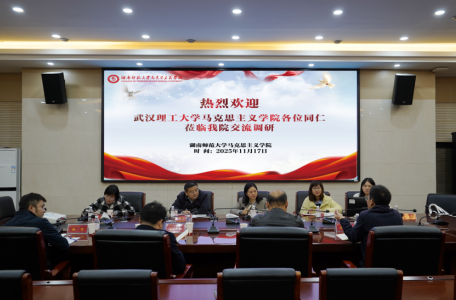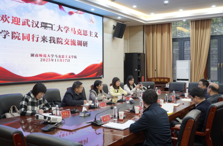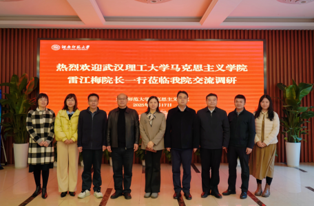 (通讯员 欧阳娴 谭邓碧萱 李欣)2025年11月17日上午,武汉理工大学马克思主义学院院长雷江梅一行5人莅临我院,围绕学科建设、师资队伍和思政课建设等议题开展交流调研。我院党委书记李泳波、院长易显飞、副院长陈德祥、思想政治教育系主任杨果参与交流。