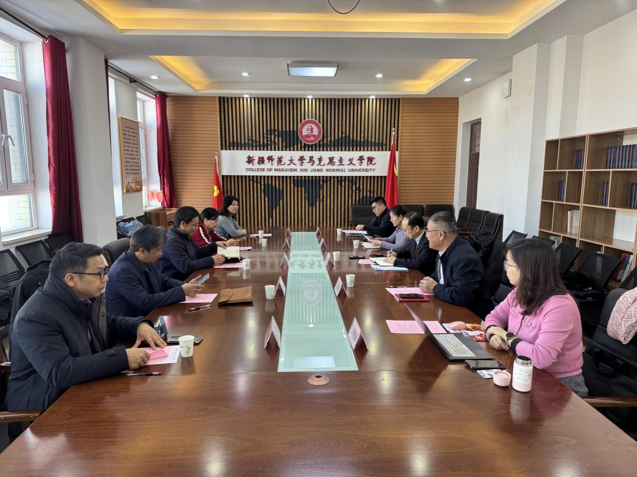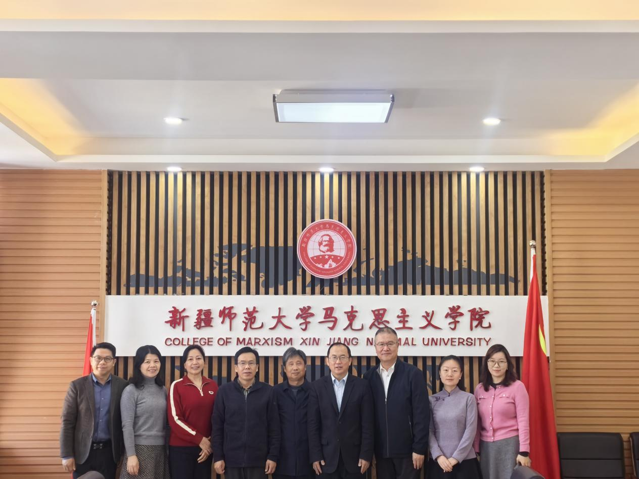 为进一步加强马克思主义理论学科建设,突出马克思主义理论学科建设的特色和优势,强化马克思主义理论学科对接国家重大战略,更好服务地方经济社会发展,12月25日,湖南师范大学马克思主义学院副院长陈德祥、学院原党委书记陈红桂、陈文珍教授、伍屏芝副教授等一行5人赴全国重点马院新疆师范大学马克思主义学院调研交流。新疆师范大学党委副书记刘俊、马克思主义学院副院长孙健、中华民族共同体概论教研室主任王茜、形势与政策教研室主任白艳丽、院长助理张文龙等参加座谈交流。