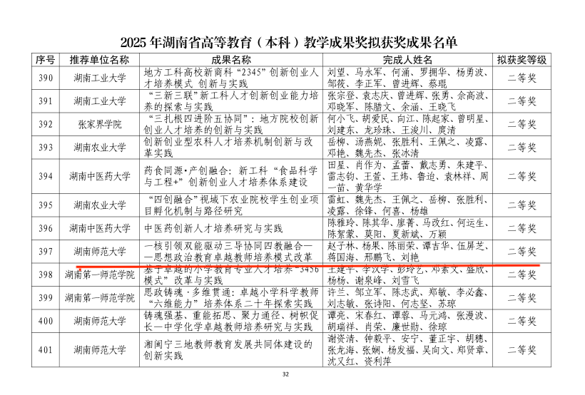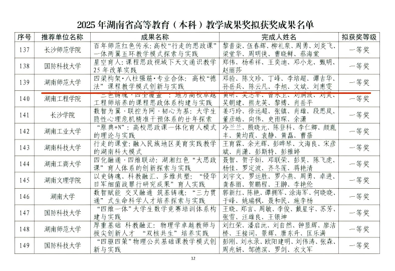 近日,湖南省教育厅公示2025年高等教育(本科)教学成果奖拟获奖名单,湖南师范大学马克思主义学院两项成果脱颖而出:邓验教授领衔团队的《四梁构架·八柱强筋·专业合体:高校“德法”课程教学模式创新与实践》(序号139)获一等奖;赵子林教授领衔团队的《一核引领 双能驱动 三导协同 四教融合——思想政治教育卓越教师培养模式改革》(序号397)获二等奖。