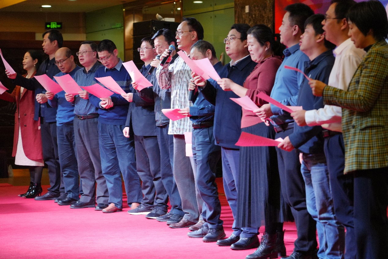 大会在庄严的国歌声中拉开帷幕,全体起立。