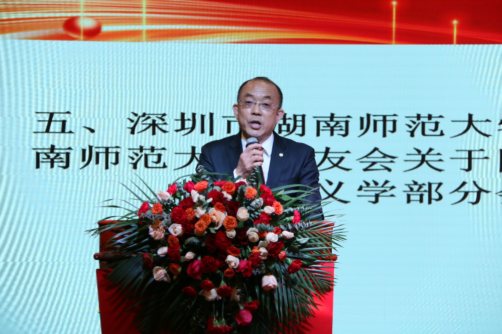 深圳市湖南师范大学校友会会长田地发表讲话。他首先对刘湘溶校长一行母校领导的到来表示热烈欢迎与诚挚感谢,深情回顾了深圳校友会创办以来在服务校友、回馈母校方面所做的努力与贡献,并就今年即将举办的校友会成立30周年庆祝大会,向刘湘溶校长等母校领导发出诚挚邀请。