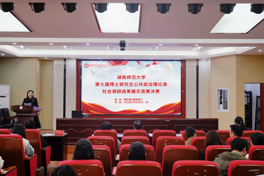(通讯员 欧阳娴 李欣 喻锦璐)1月15日下午,湖南师范大学第七届博士研究生思想政治理论课社会调研成果展示竞赛决赛在博后楼四楼报告厅举行,校研究生院副院长苏涵琼、马克思主义学院党委书记李泳波、马克思主义学院副院长陈德祥、马克思主义学院教授刘先江、马克思主义学院教授刘晓玲、马克思主义学院研究生思政课教研部主任徐新等出席此次活动并担任评审专家,马克思主义学院科研办主任、研究生辅导员周律老师主持会议。