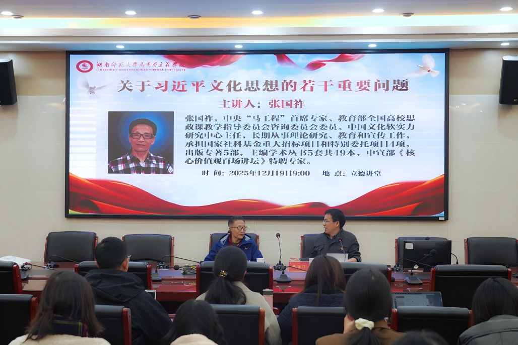 (通讯员张馨月李欣)2025年12月19日上午,中央马克思主义理论研究和建设工程首席专家、教育部全国高校思政课教学指导委员会咨询委员会委员、中国文化软实力研究中心主任、中宣部理论局原副局长、国家社科规划办原主任张国祚教授应邀为我院师生开展了题为《关于习近平文化思想的若干重要问题》的学术讲座。本次讲座在马克思主义学院立德讲堂举行,学院副院长陈德祥教授主持,2025级研究生和部分老师参加了讲座。