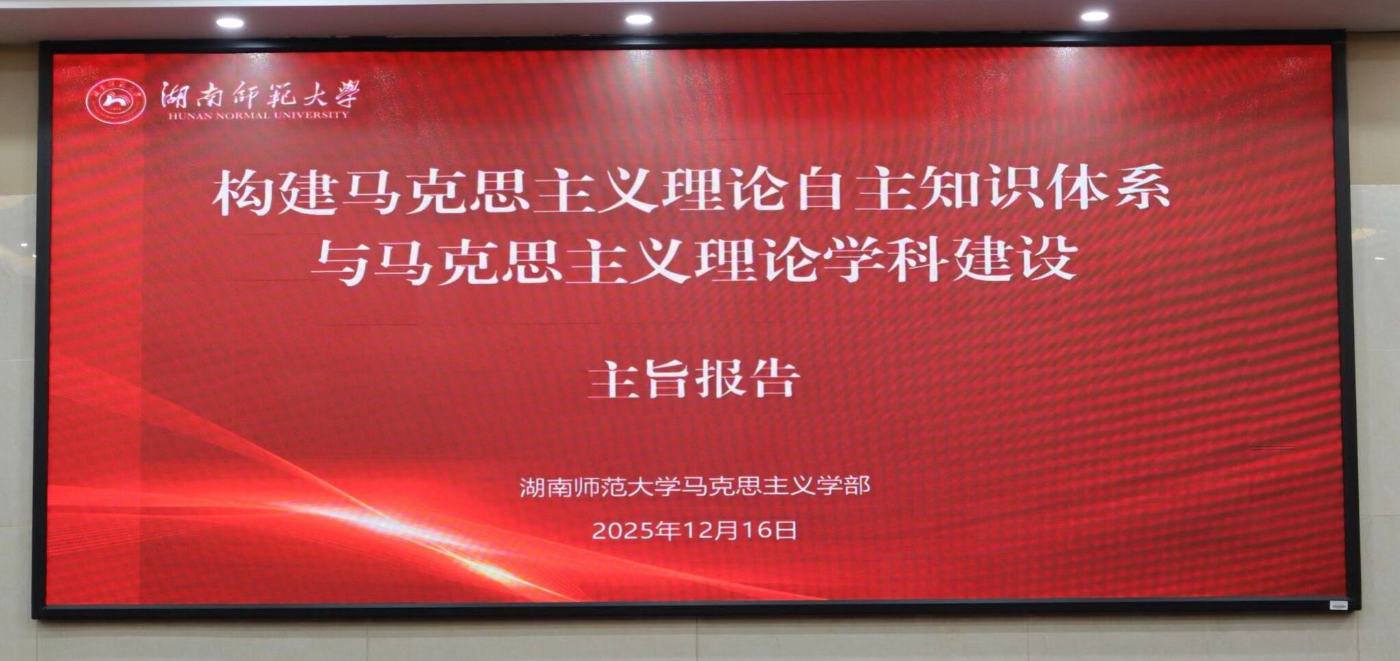 为深入探讨新时代马克思主义理论自主知识体系构建,推动马克思主义理论学科高质量发展,2025年12月16日下午,湖南师范大学马克思主义学部马克思主义学院召开“构建马克思主义理论自主知识体系与马克思主义理论学科建设”学术研讨会,来自东北师范大学、国防科技大学、湖南大学、湘潭大学等多所高校的专家出席并发言。本次活动由马克思主义学院院长易显飞、党委书记李泳波共同主持。发展规划与学科建设处处长孙岳兵,学院副院长陈德祥、汤小红,学院党委副书记易珊及学院50余名师生到会聆听。