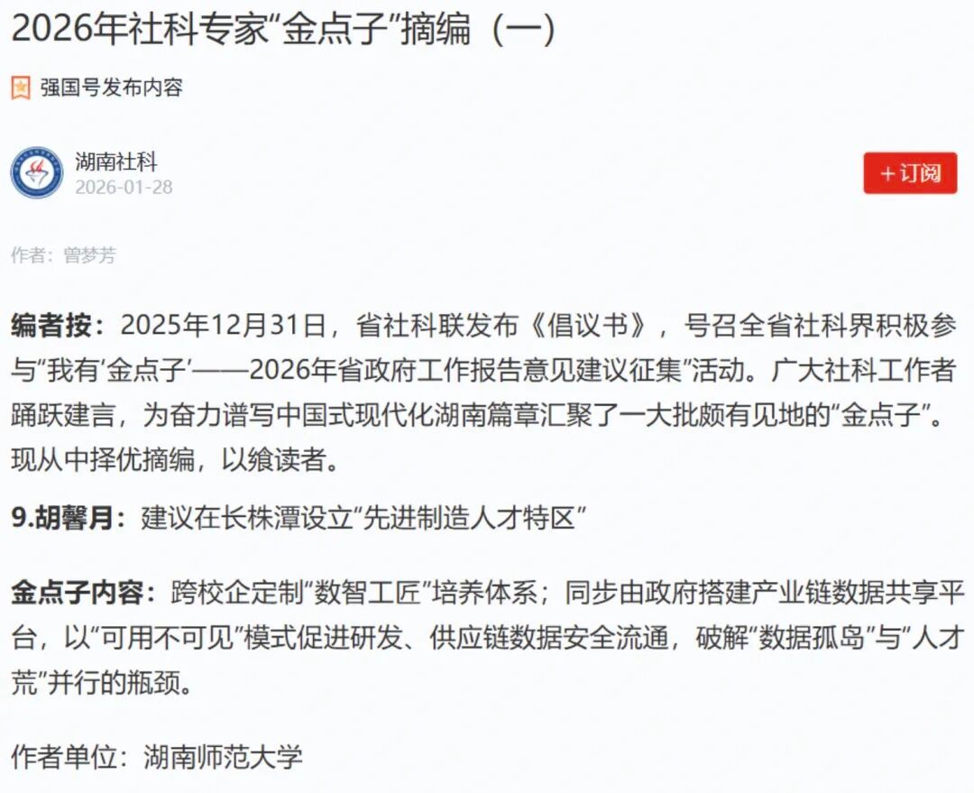 近日,在湖南省社科联组织的“我有‘金点子’——2026年省政府工作报告意见建议征集”活动中,我院宁国良老师团队、胡馨月老师提交的三条建议从众多建言中脱颖而出,被正式采纳,并已通过“湖南社科”微信公众号及“学习强国”平台公开发布,充分彰显了我院在服务地方发展战略中的重要贡献。