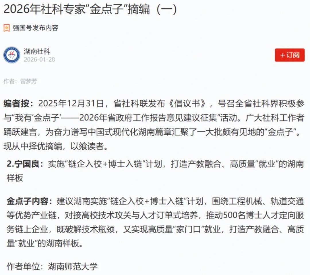 宁国良教授建议实施“链企入校+博士入链”计划,打造产教融合、高质量“就业”的湖南样板,旨在推动优势产业链与高校深度对接,通过人才定向培养与输送,破解企业技术瓶颈,为高校毕业生在省内实现高质量就业提供有力支撑。