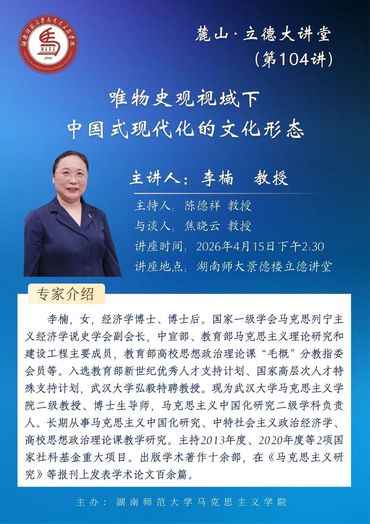 【专家简介】李楠,女,经济学博士、博士后。国家一级学会马克思列宁主义经济学说史学会副会长,中宣部、教育部马克思主义理论研究和建设工程主要成员,教育部高校思想政治理论课“毛概”分教指委会员等。入选教育部新世纪优秀人才支持计划、国家高层次人才特殊支持计划,武汉大学弘毅特聘教授。现为武汉大学马克思主义学院二级教授、博士生导师,马克思主义中国化研究二级学科负责人。长期从事马克思主义中国化研究、中特社会主义政治经济学、高校思想政治理论课教学研究。主持2013年度、2020年度等2项国家社科基金重大项目。出版学术著作十余部,合著获2项省部级优秀社科成果奖。在《马克思主义研究》等报刊上发表学术论文百余篇,主持、参与的教改项目获校级、省级、国家级优秀教学成果奖十余项。荣获全国“高校思想政治理论课教师2016年度影响力标兵人物”、2020年度“湖北教学名师”“武汉大学教学名师”“武汉大学杰出教学贡献校长奖”以及武汉大学第七届“查全性教授1977奖教金”。指导学生获得第十九届“挑战杯”2024年度“揭榜挂帅”专项赛“擂主”(特等奖第一名)、第十八届“挑战杯”大学生课外学术科研作品竞赛二等奖。 【内容提要】本讲座以“中国式现代化的文化形态”为思考对象,探讨其内涵要义、形成逻辑与构建路径。主讲人先后论及:中国式现代化文化形态蕴含丰富的哲学意蕴、鲜明的时代特征和深厚的文明根基;这一文化形态是在“两个结合”中不断生成、发展和完善的新文化形态;构建这一文化形态要坚持以马克思主义为指导、扎根中华优秀传统文化,并坚守精神上的独立自主。