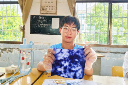 “趣味扎染”则聚焦于植物“色”的运用。实践团成员指导学生利用天然植物染料,结合捆扎技法进行创作。布料经浸染上色、展开后,形成自然晕染的图案。