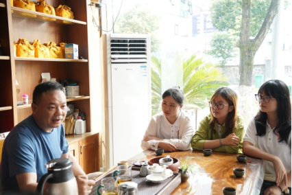 调研伊始,张勇与实践团围坐茶桌,展开交流。他介绍了碣滩茶的历史渊源与文化底蕴,并阐述了公司核心茶叶品类及在品质、品牌方面取得的重要荣誉。对于茶叶生产关键环节,张勇详细说明了不同茶类的采摘时令与标准,如“单芽”、“一芽一叶”等。