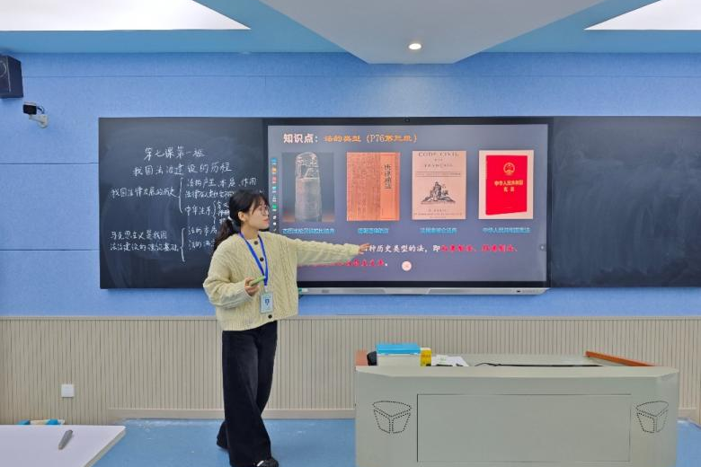 实习队员围绕高中思想政治必修三《政治与法治》第七课第一框《法治建设的历程》,依次进行课堂试讲。试讲过程中,队员们紧扣教材核心知识点,结合高中学生的认知特点,采用案例分析、时间轴梳理、议题式探究等多元教学方法,展现出认真的备课态度和扎实的思政专业素养。